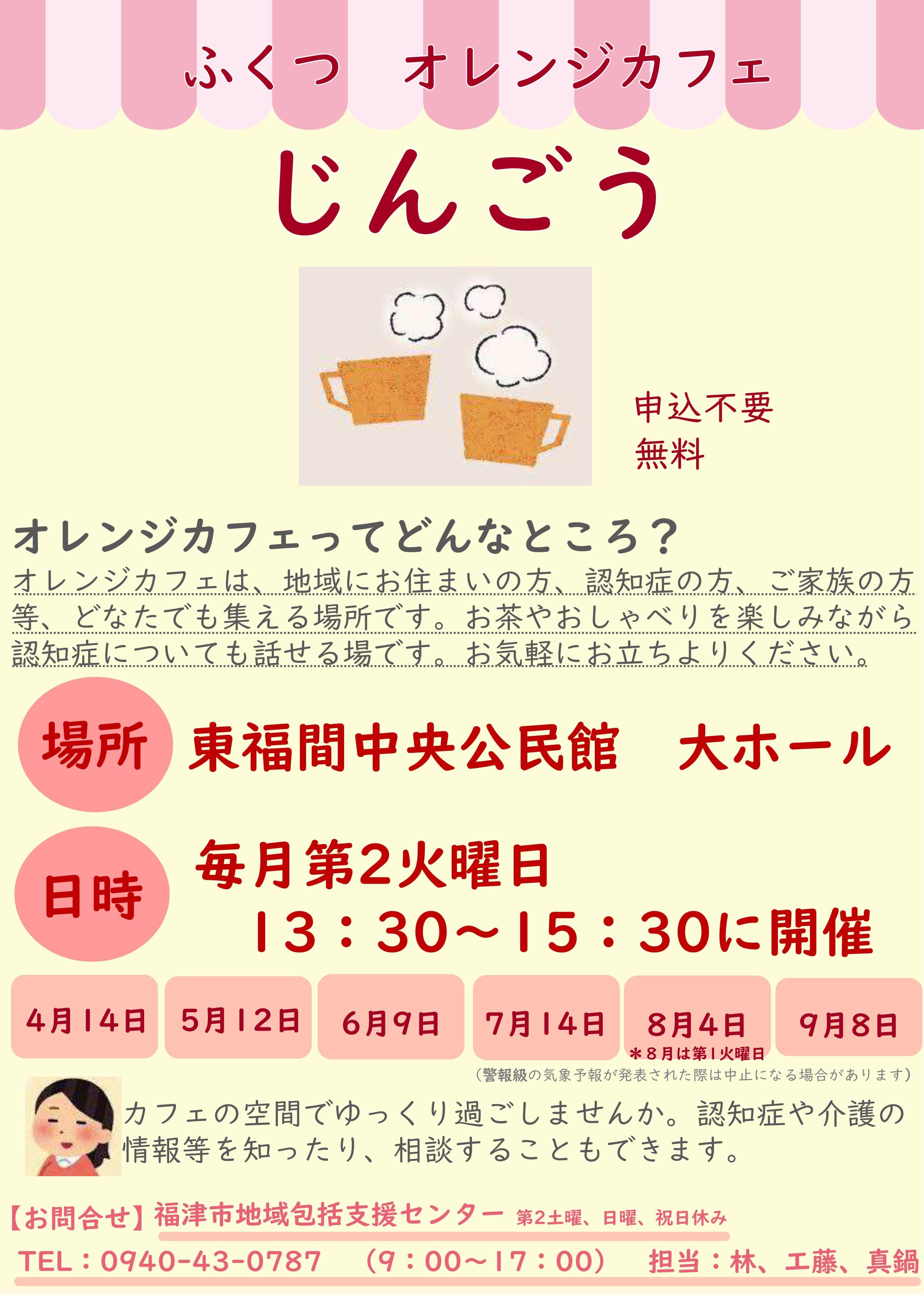 オレンジカフェは地域にお住いの方、認知症の方、ご家族の方等、どなたでも集える場所です。お茶やおしゃべりを楽しみながら、認知症の情報を知ることもできます。申し込み不要です。お気軽にお立ちよりください。