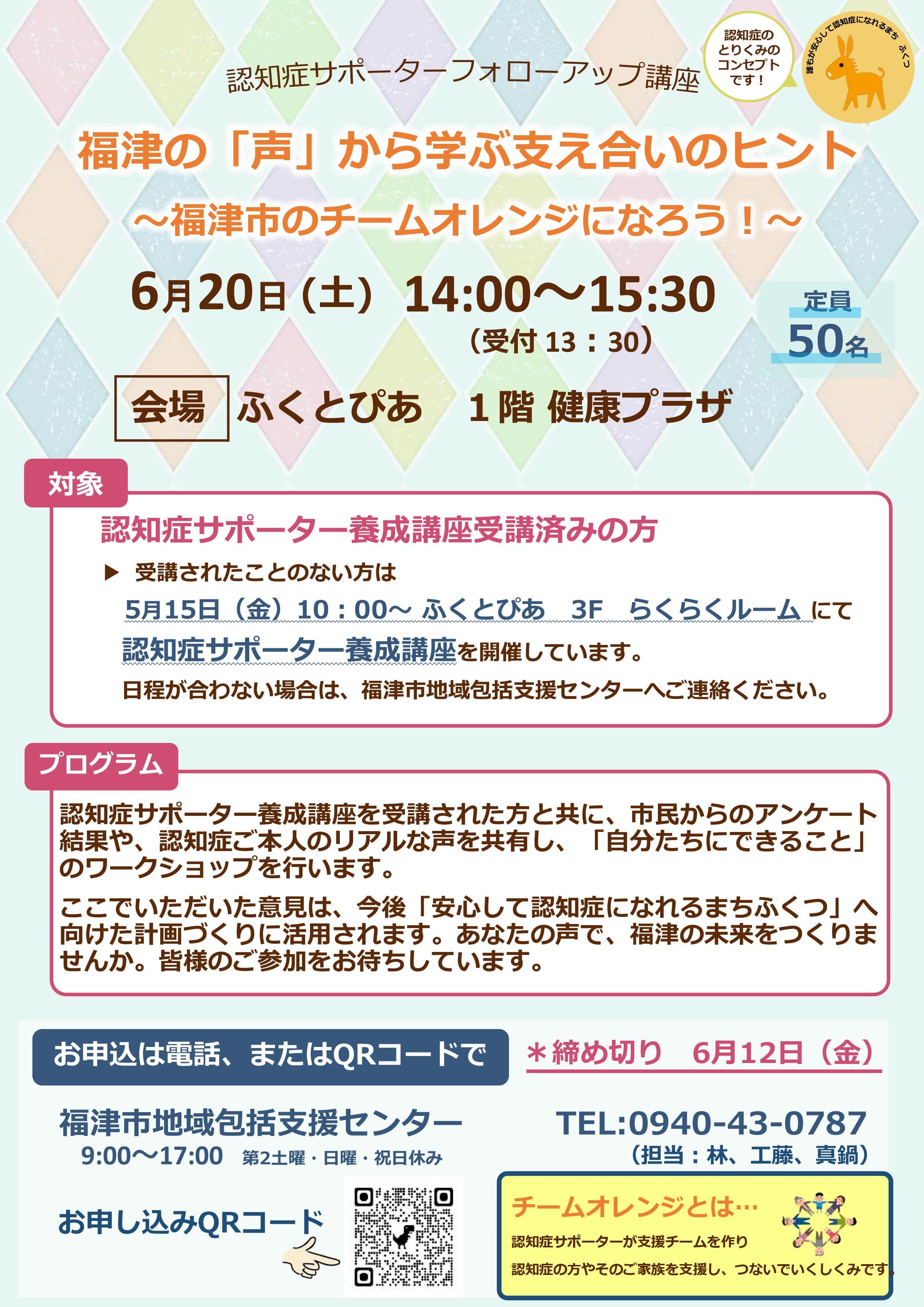 認知症サポーター養成講座を受講された方と共に、市民からのアンケート結果や、認知症ご本人のリアルな声を共有し、「自分たちにできること」のワークショップを行います。ここでいただいた意見は、今後、「安心して認知症になれるまち ふくつ」へ向けた計画づくりに活用されます。あなたの声で、福津の未来をつくりませんか。認知症サポーター養成講座と日程が合わない場合は福津市地域包括支援センターまでご相談ください。