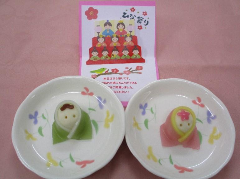 昼食に、ちらし寿司と三色そうめん、おやつには、ひな人形の和菓子を提供いたしました。
