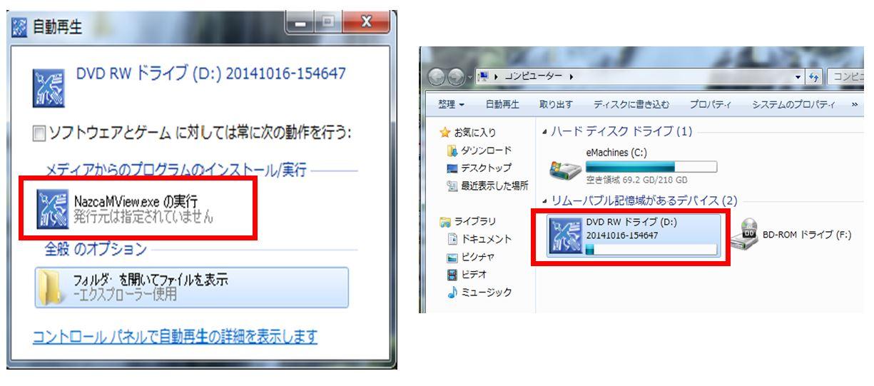 ここから「NazcaMView.exeの実行」をダブルクリックするか、パソコンのスタートボタン→コンピューターから、ディスクを入れたドライブをダブルクリックすることでもNazcaMViewが起動します。