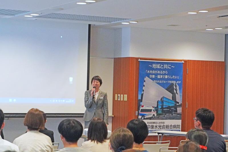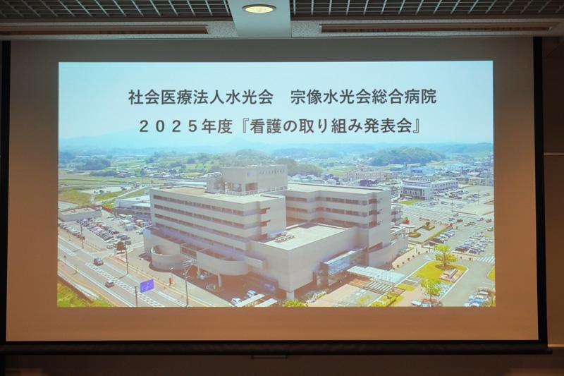 看護部長より「今回の発表会では、私たち看護部がこの一年間、仲間と共に積み重ねてきたラダー別の看護過程の実践報告、入退院支援委員会による症例報告、昨年度発足した院内認定創傷ケア看護師による症例報告、看護管理者実践報告など、様々な取組の中から一部症例をスタッフ自身の言葉でご紹介させていただきます。私たち看護師自身の成長を実感する場となり、そして地域・関係機関の皆さまと看護を通じたつながりをさらに深めるきっかけとなれば幸いです。」と挨拶いたしました。