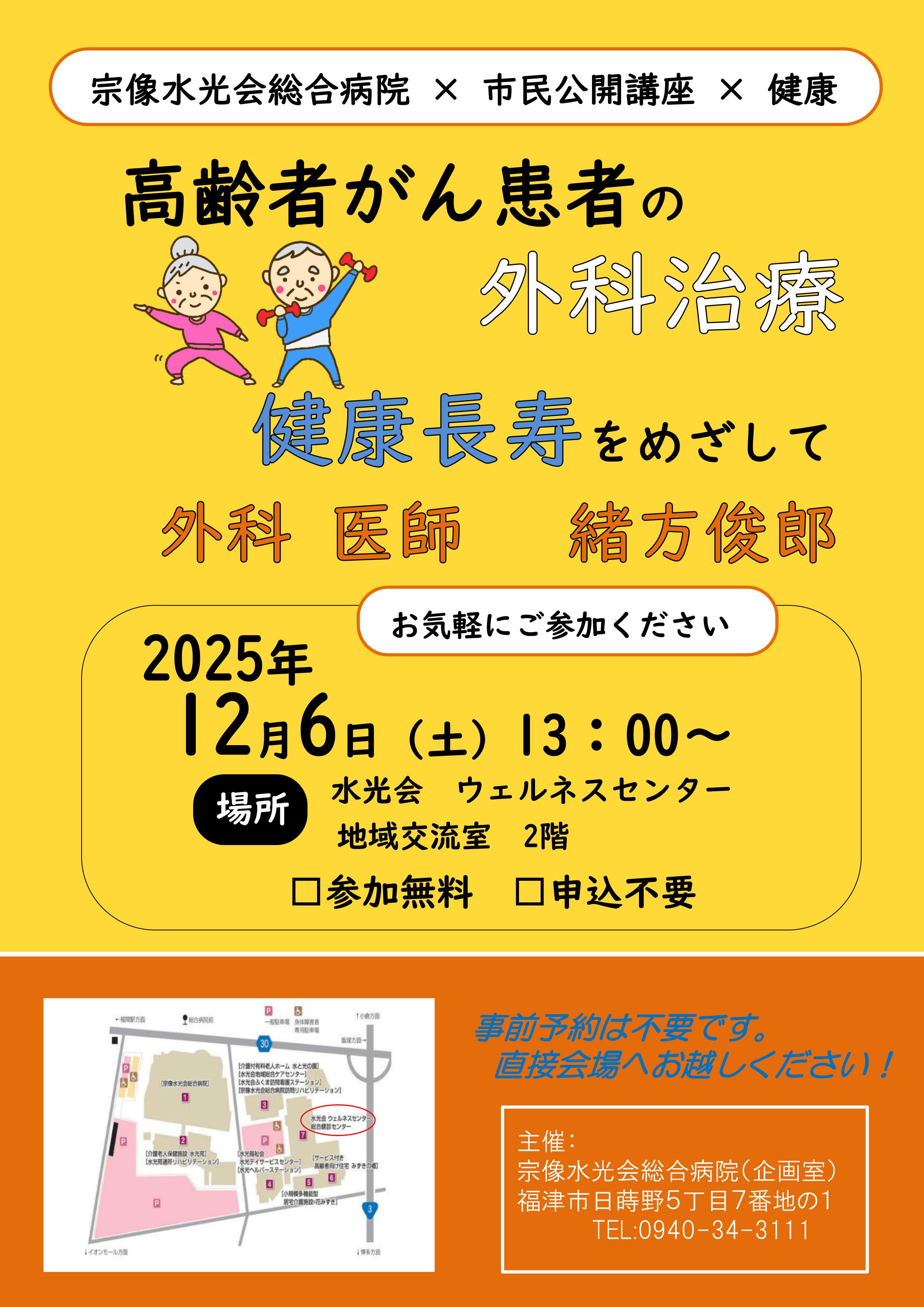 2025年12月6日(土)開催予定の市民公開講座についてお知らせいたします。今回は「高齢者がん患者の外科治療 健康長寿をめざして」というテーマで、外科 緒方医師がお話をいたします。講座後に質問ができる時間もありますので、日頃の悩みや疑問を解決するチャンスです。ぜひお気軽にご参加ください。