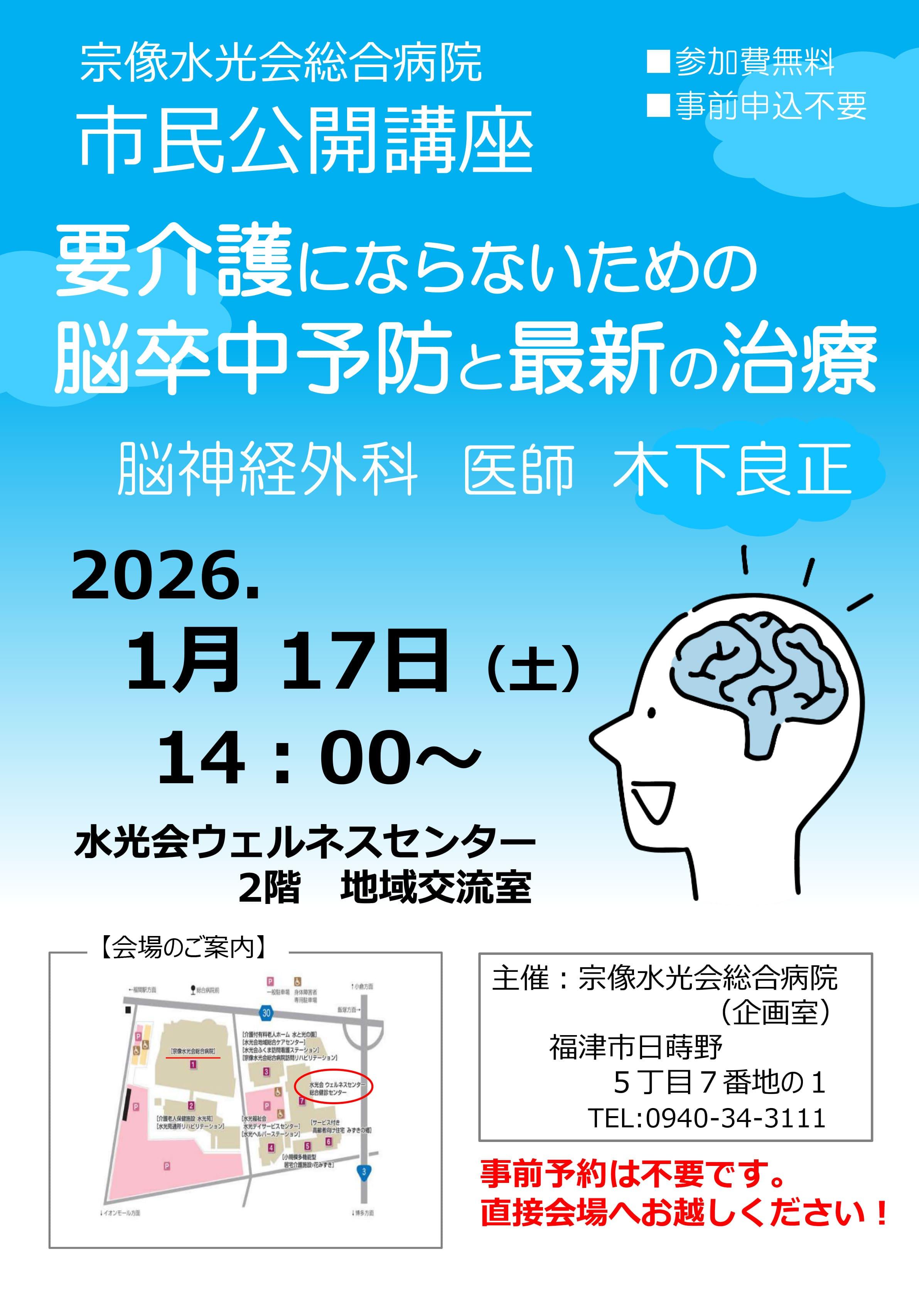 2026年1月17日(土)開催予定の市民公開講座についてお知らせいたします。今回は「要介護にならないための脳卒中予防と最新の治療」というテーマで、脳神経外科 木下医師がお話をいたします。講座後に質問ができる時間もありますので、日頃の悩みや疑問を解決するチャンスです。ぜひお気軽にご参加ください。
