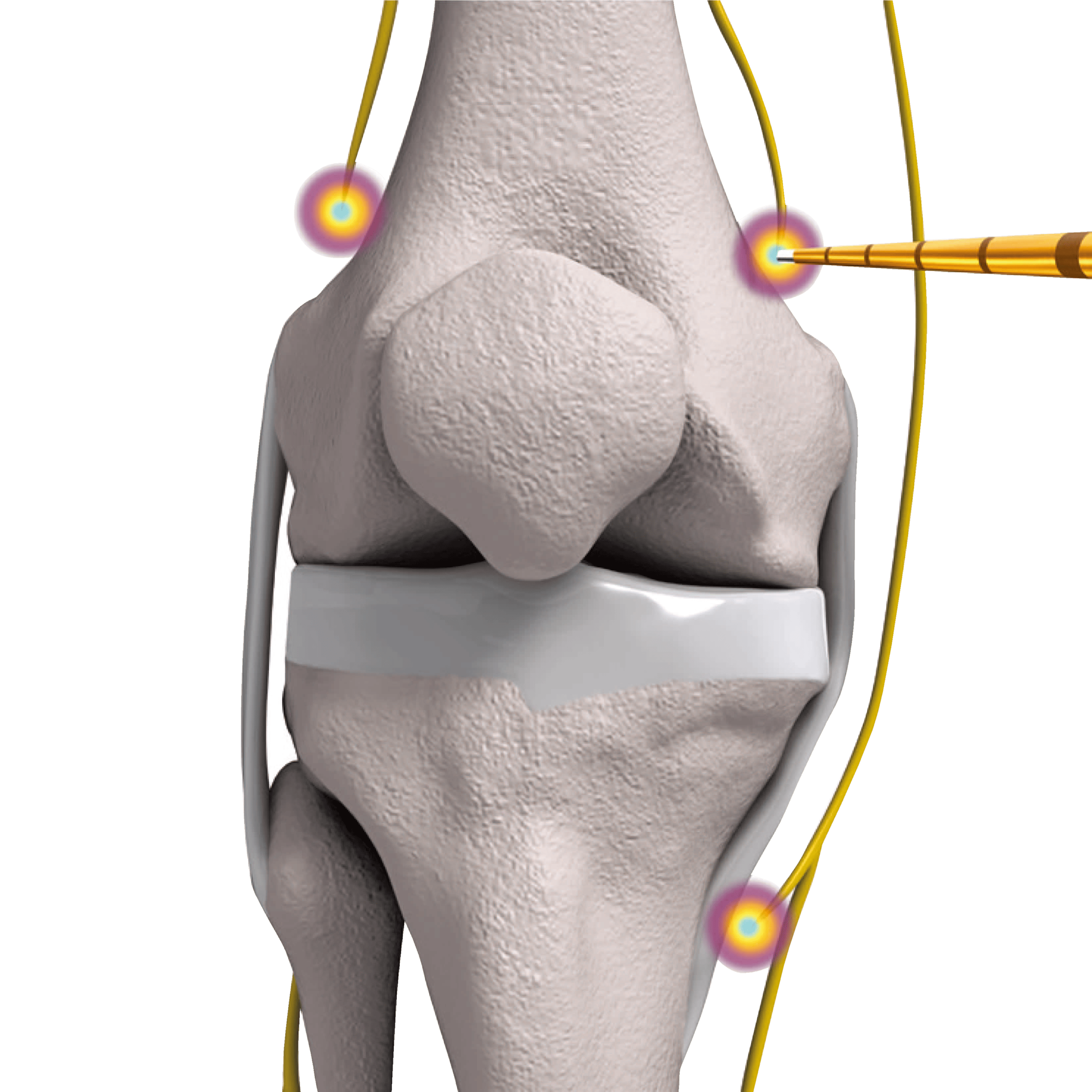 超音波エコーで確認しながら、皮膚の上から電極針を挿入し、膝の痛みを伝える神経に対してラジオ波(高周波電流)を流します。この電流によって針の先端に熱を発生させ、痛みの伝達を抑えることで、膝の痛みの軽減を図ります。