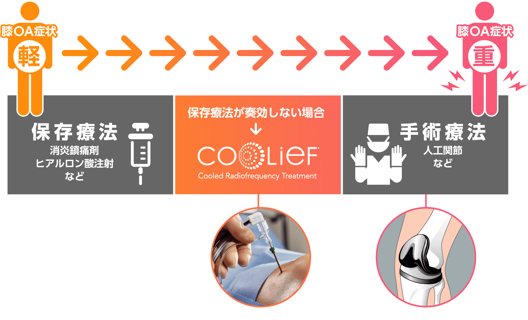 Coolief(クーリーフ)疼痛管理用高周波システム(ラジオ波治療)は、変形性膝関節症による痛みがある患者さんのうち、消炎鎮痛剤やヒアルロン酸注射などの保存療法で十分な効果が得られない方に対し、痛みの軽減を目的として行う新しい治療法です。