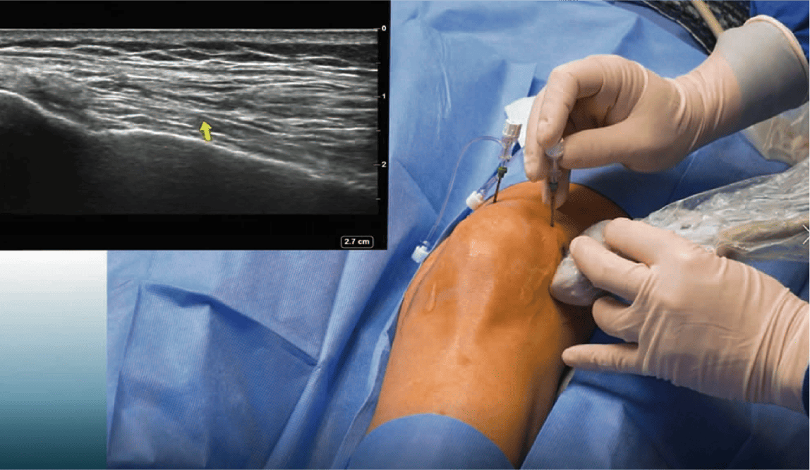 超音波エコーで確認しながら、皮膚の上から電極針を挿入し、膝の痛みを伝える神経に対してラジオ波(高周波電流)を流します。この電流によって針の先端に熱を発生させ、痛みの伝達を抑えることで、膝の痛みの軽減を図ります。